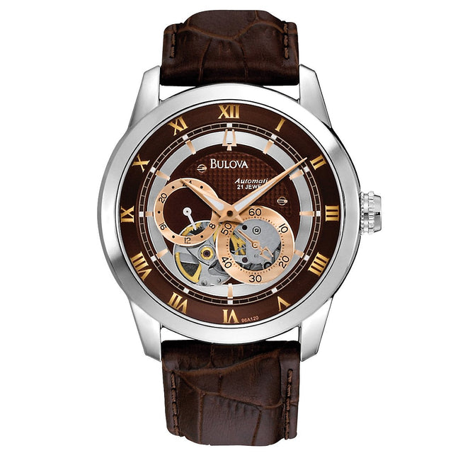 El Bulova 96A120 es un elegante reloj mecánico automático con doble ventana abierta en la esfera que permite apreciar el movimiento interno de 21 joyas. Su diseño combina acero inoxidable, detalles en oro rosa y una correa de piel marrón, logrando una estética clásica, refinada y con carácter.
