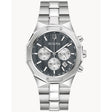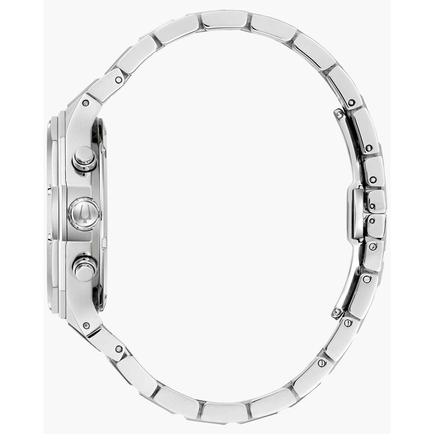 • Descripción: El diseño moderno y audaz distingue a este cronógrafo de seis agujas de la colección Classic Prestige de Bulova para hombre. Presenta una caja geométrica de acero inoxidable en tono plateado de 40 mm con cristal de zafiro plano con tratamiento antirreflejante, una elegante esfera gris con textura a rayas, marcadores y agujas aplicadas en tono plateado con relleno luminiscente Super-LumiNova, e indicador de fecha. Su brazalete de acero inoxidable de tres eslabones combina acabados cepillados y pulidos, con un cierre desplegable con botón pulsador. Impulsado por un movimiento de cuarzo japonés 0S20, este reloj ofrece precisión, cronógrafo y calendario, además de resistencia al agua de 100 metros.