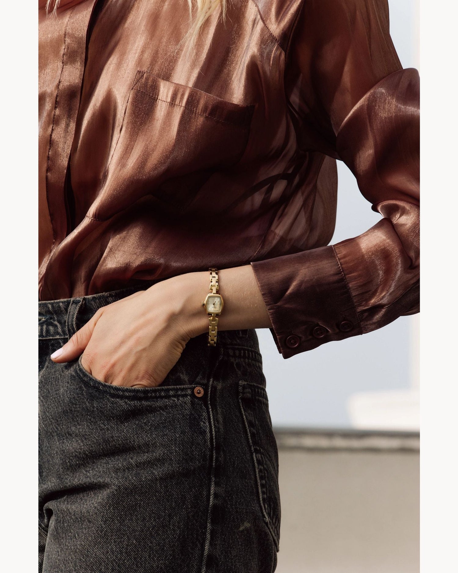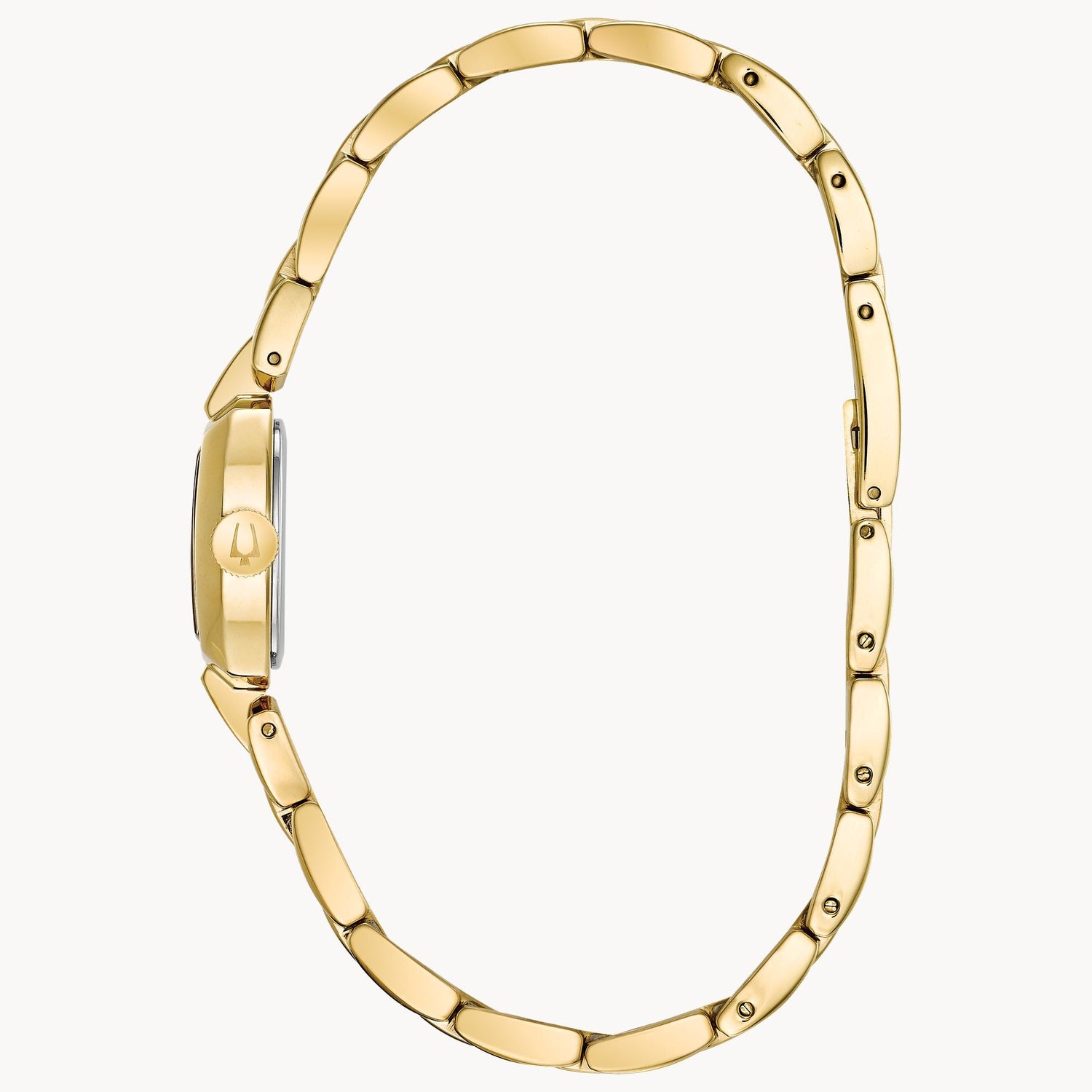 • Descripción: De la Colección Clásica de Bulova, este elegante reloj para mujer combina el brillo del acero inoxidable en tono dorado con una esfera color champán que irradia calidez y distinción. Su cristal mineral curvado aporta un toque vintage y realza los reflejos dorados de la carátula. El brazalete en tono dorado con cierre tipo joya asegura un ajuste cómodo y sofisticado. Impulsado por un movimiento de cuarzo japonés de alta precisión, este modelo encarna la elegancia clásica y la sencillez refinada característica de Bulova.