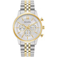 Elegante reloj cronógrafo de acero inoxidable bicolor con esfera plateada y movimiento de cuarzo.