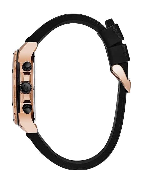 • Material: Cronógrafo de acero inoxidable con acabado iónico negro y oro rosa