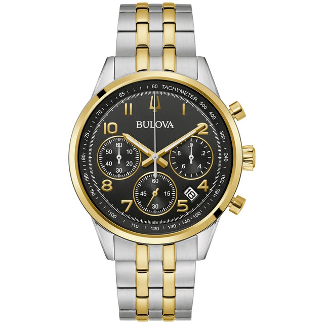 Reloj de vestir Classic con caja de acero inoxidable bicolor de 42 mm, correa de acero bicolor y esfera negra con cronógrafo y pequeña segundera.