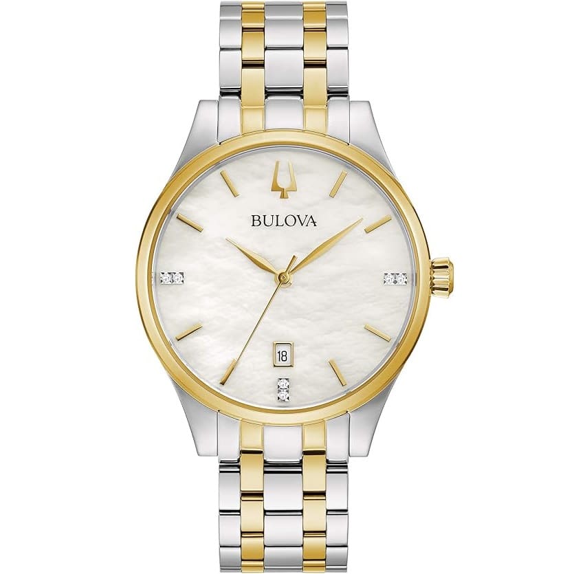 • Caja y brazalete de acero inoxidable bicolor con una esfera de nácar blanca con seis diamantes y una ventana de fecha en la posición de las seis en punto. Cristal mineral plano y resistencia al agua hasta 99 pies.
