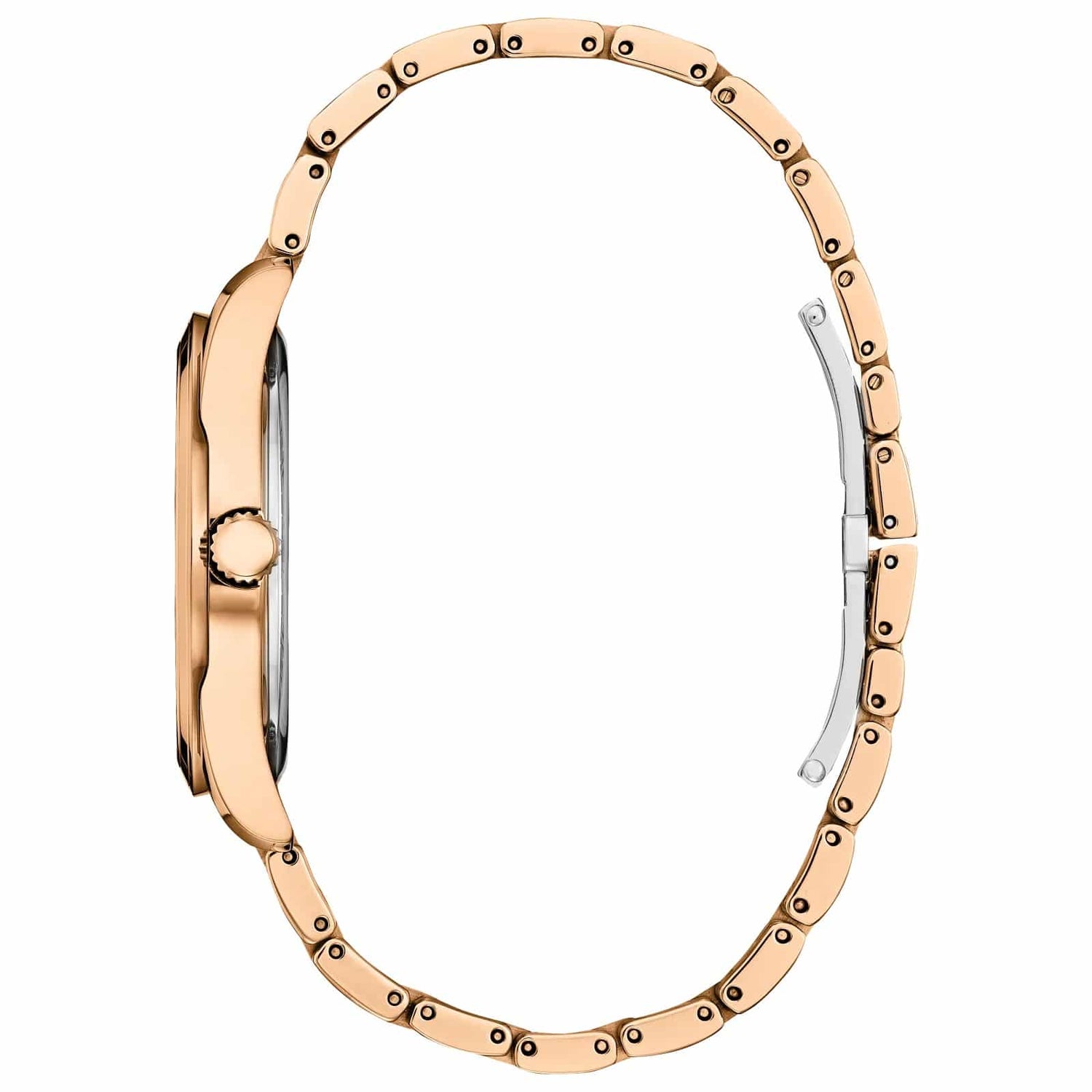 • Material de la caja: Acero inoxidable en tono oro rosa, ideal para un estilo sofisticado.