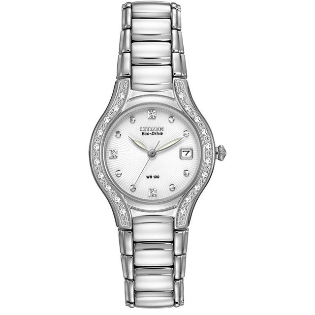 Reloj Citizen para mujer de la colección Silhouette, con elegante diseño en acero inoxidable plateado, bisel con diamantes y carátula plateada. Funciona con tecnología Eco-Drive, alimentado por la luz para un rendimiento confiable sin necesidad de batería.
