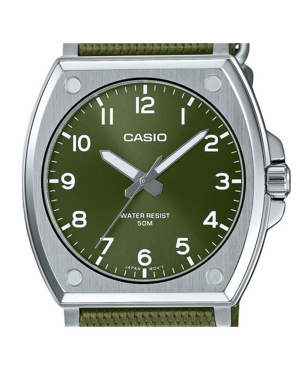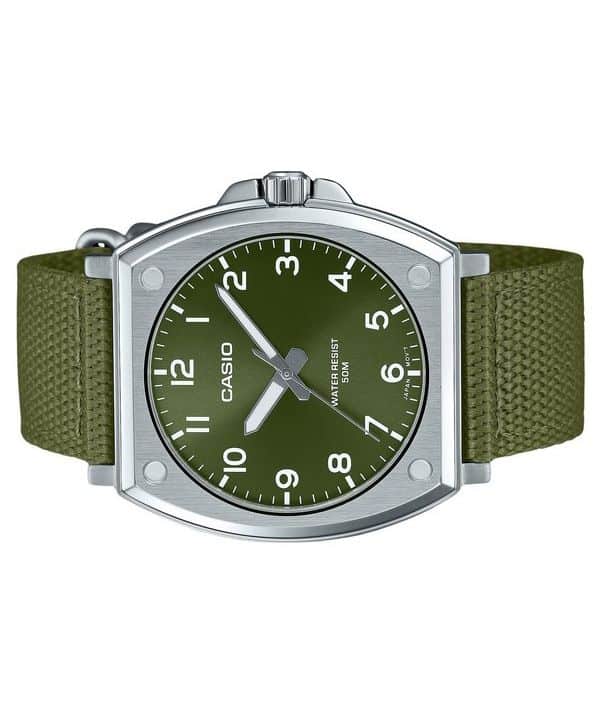 Reloj Casio analógico estándar con correa de tela y esfera verde de cuarzo MTP-E730C-3AV MTPE730C-3 para hombre