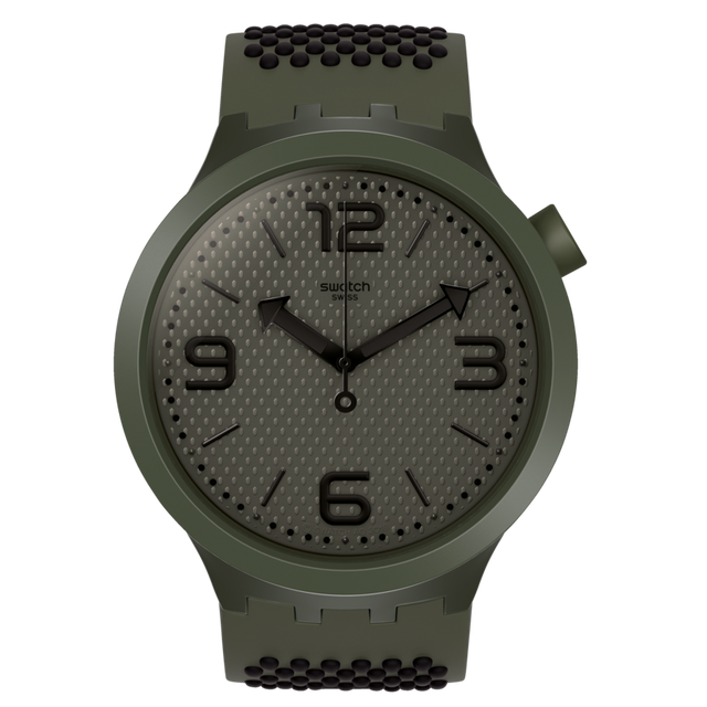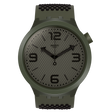 Reloj Swatch de estilo moderno y monocromático en verde oliva, con caja de gran tamaño y movimiento de cuarzo suizo. Su diseño limpio y uniforme lo convierte en una pieza llamativa y versátil para uso diario.