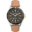 • Descripción: Reloj de acero inoxidable con caja de 41 mm, bisel dorado, esfera negra con marcadores completos y correa de cuero marrón de dos piezas con sistema de liberación rápida.