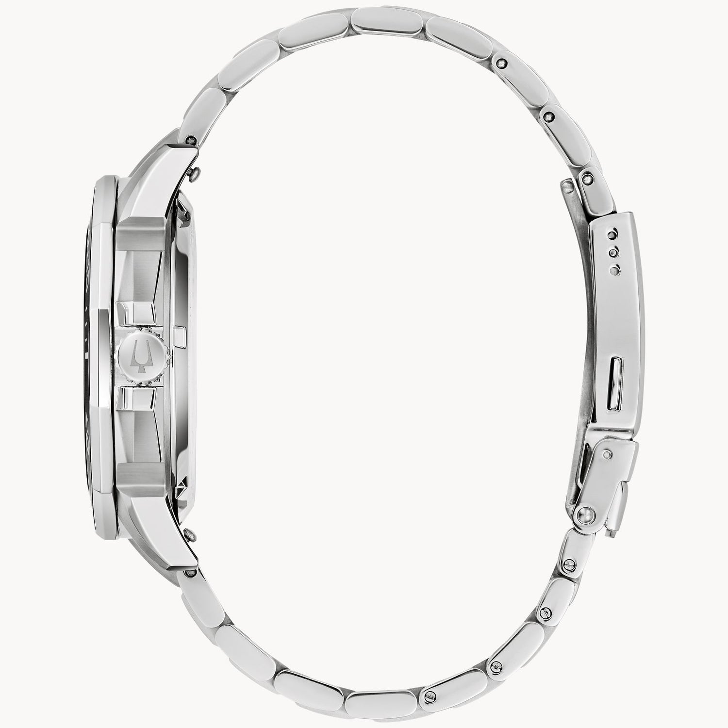 Reloj Bulova modelo 96B426 con movimiento HPQ Precisionist de alta frecuencia, caja de acero inoxidable de 43 mm, cristal de zafiro antirreflejante, esfera blanca con detalles plateados y luminiscentes, brazalete de acero inoxidable y resistencia al agua de 200 metros.