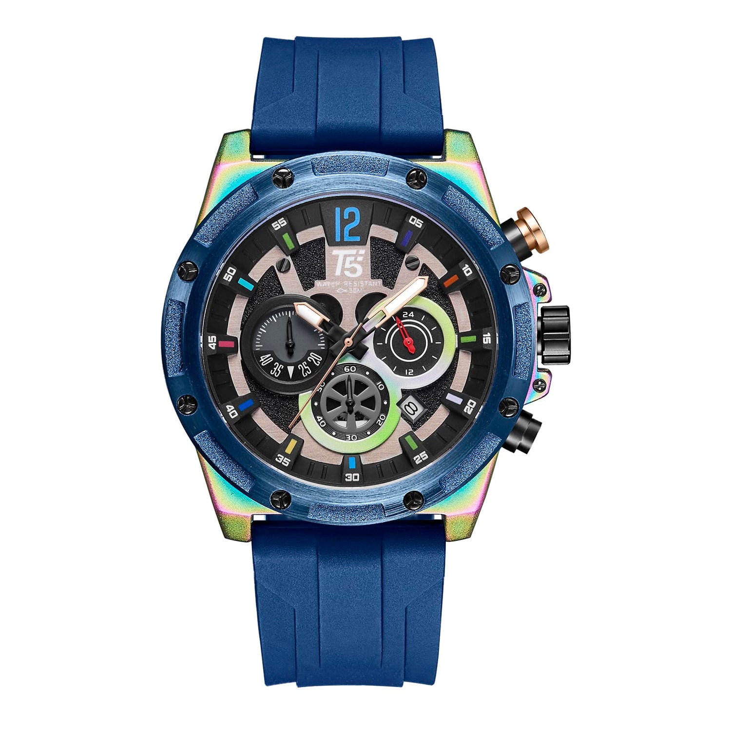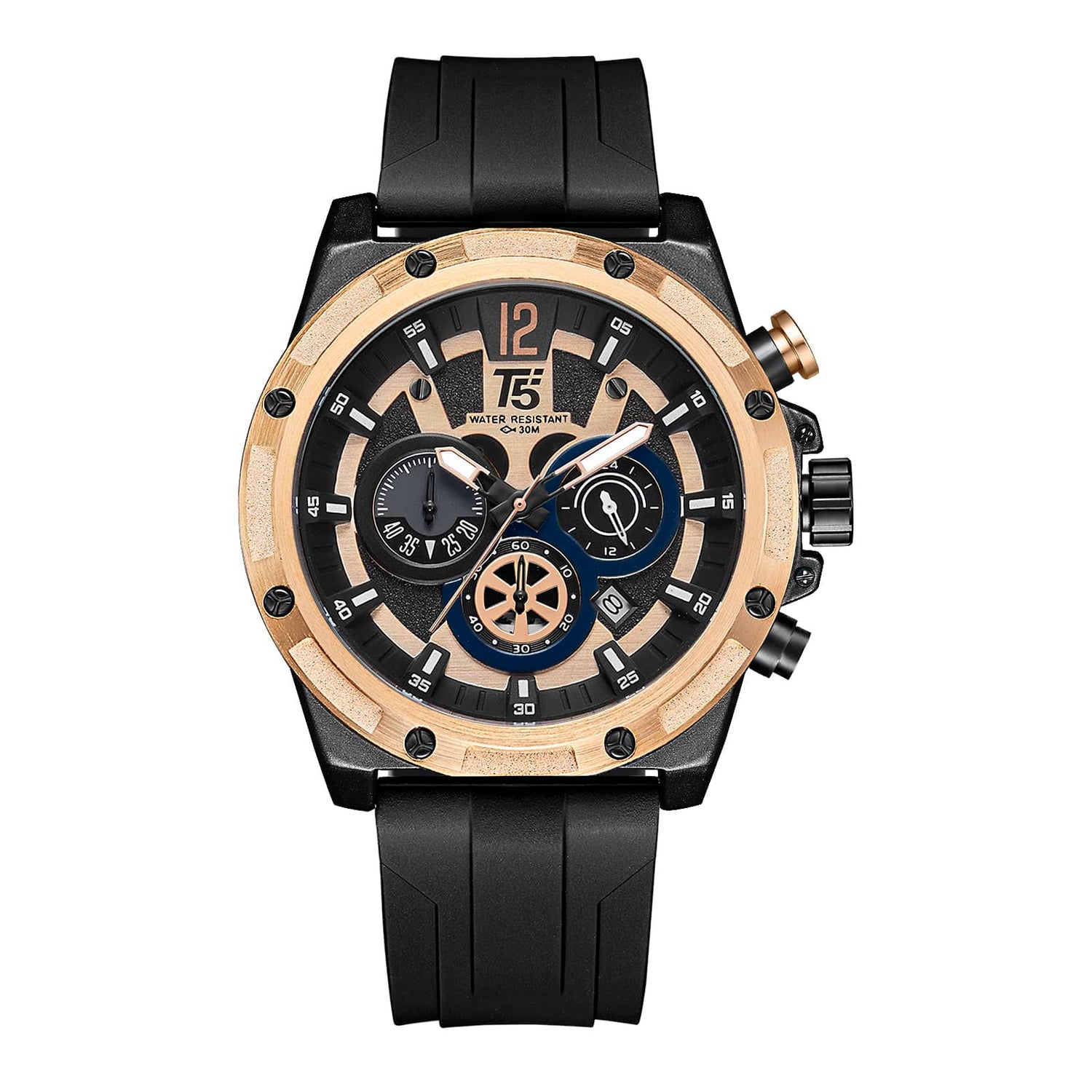 TOMA EL CONTROL DE TU TIEMPO CON UN RELOJ T5. Reloj casual elegante con maquinaria japonesa que garantiza una precisa medición del tiempo. Caja de acero pintada con tecnología ION PLATING (IP) que brinda mayor adherencia y durabilidad de la pintura. Corona, pulsadores y broche en acero inoxidable. Correa de Acero Inoxidable y correa de Silicona de alta calidad. Luna de cristal mineral. Resistencia al agua 3ATM (30 metros).
