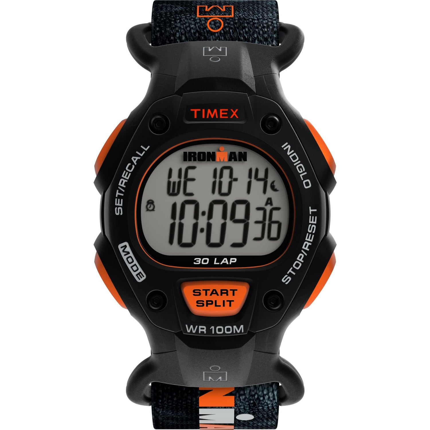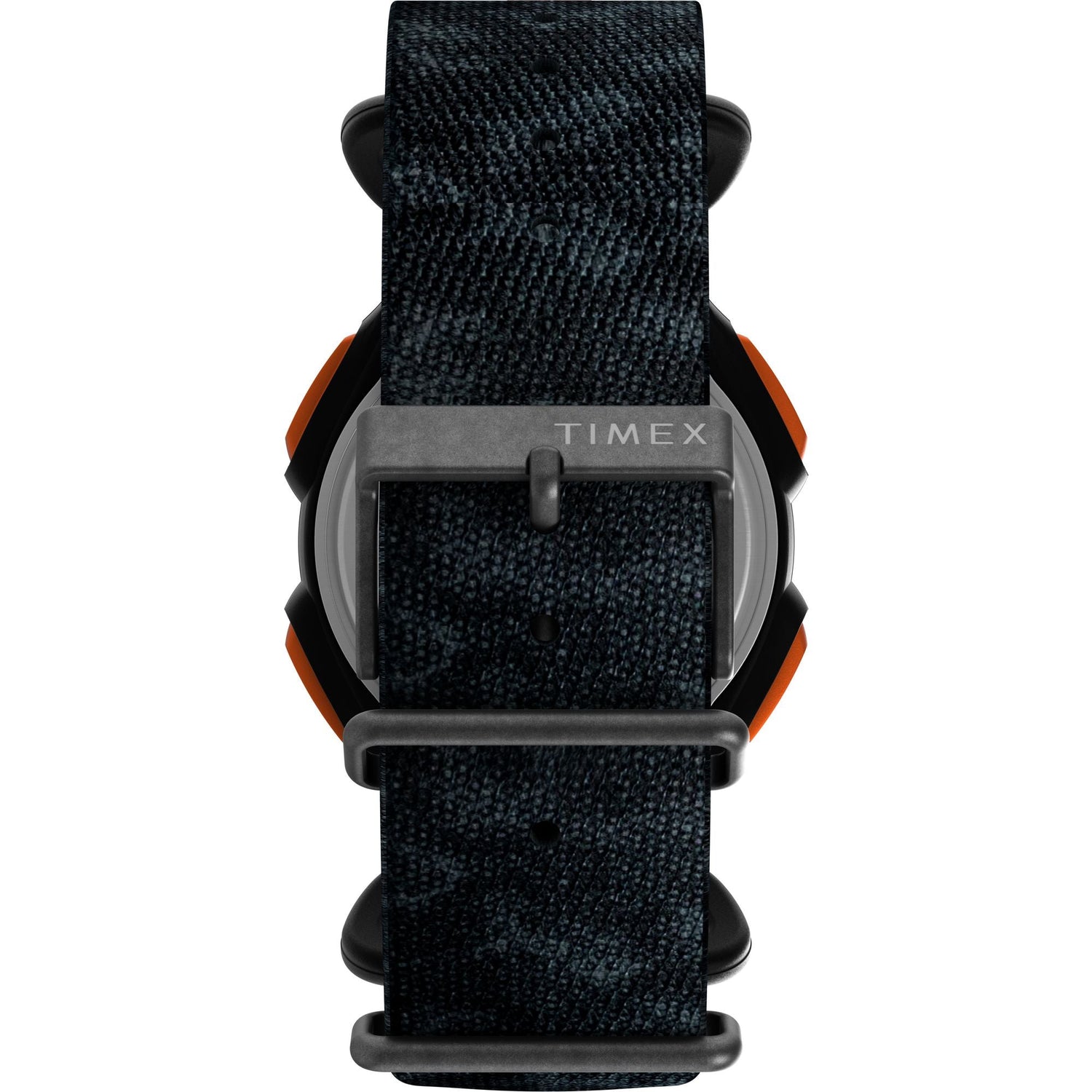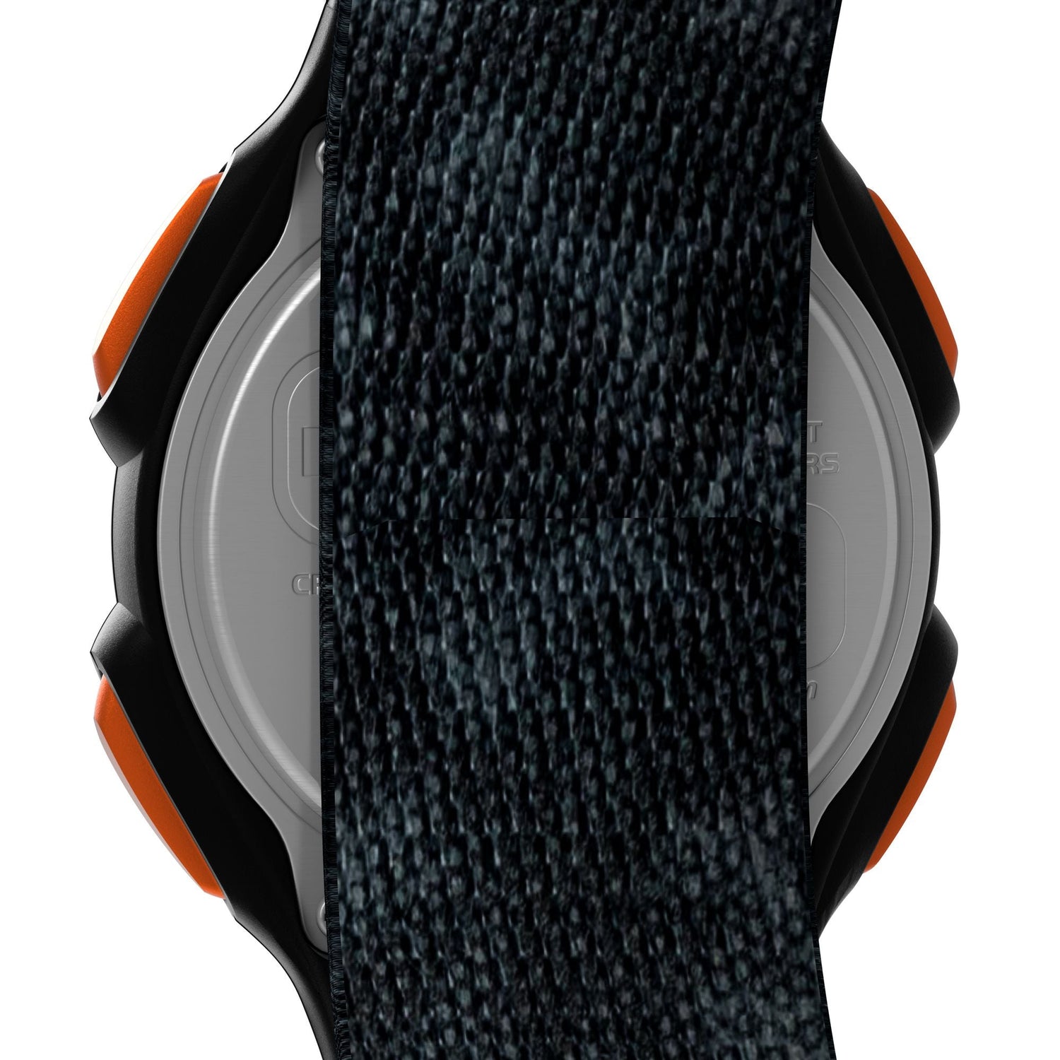 • Descripción: Reloj TIMEX® IRONMAN® Classic 30-Lap de 38 mm con caja de resina negra con acentos naranjas y acabado arenado, correa Slip-thru de tela reciclada negra con hebilla plateada, pantalla digital con funciones deportivas y cronómetro, e iluminación Indiglo®; resistencia al agua de 100 metros.