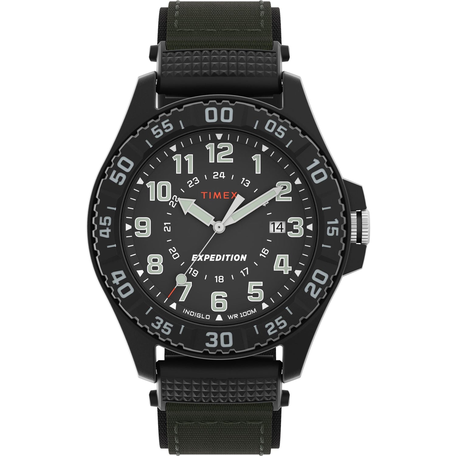 • Descripción: Reloj Timex Expedition® Acadia Rugged de 42 mm con caja de resina negra, esfera negra con números arábigos completos y manecillas luminiscentes, correa de tela verde/negra con hebilla de acero inoxidable, e iluminación Indiglo®; resistencia al agua de 100 metros.