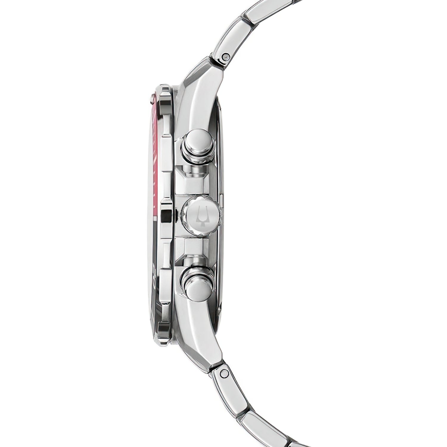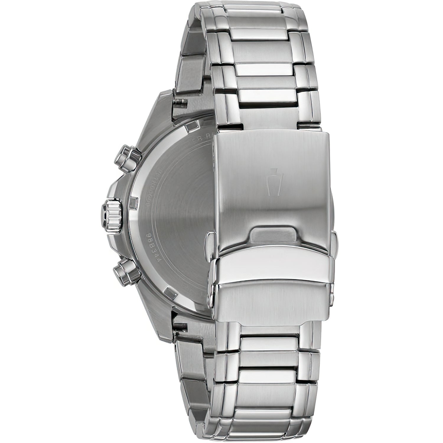 Reloj Bulova con diseño deportivo y elegante, ideal para el uso diario. Su caja y brazalete de acero inoxidable en tono plateado se combinan con una carátula negra con indicadores y manecillas luminiscentes. Equipado con movimiento de cuarzo de alta precisión y función de cronógrafo, este modelo destaca por su estilo funcional y sofisticado.
