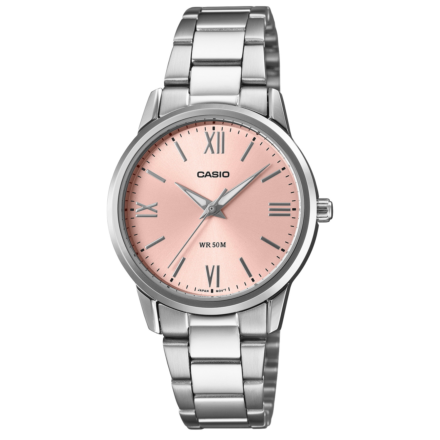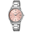Reloj Casio para mujer con un diseño elegante y femenino, esfera color rosa y brazalete de acero inoxidable. Su estética clásica combinada con resistencia al agua y manecillas luminiscentes lo convierten en un modelo ideal para el uso diario.