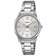 Reloj Casio para mujer con diseño clásico y refinado, esfera plateada y brazalete de acero inoxidable. Un modelo elegante, resistente al agua y perfecto para uso diario gracias a su construcción sólida y estilo atemporal.