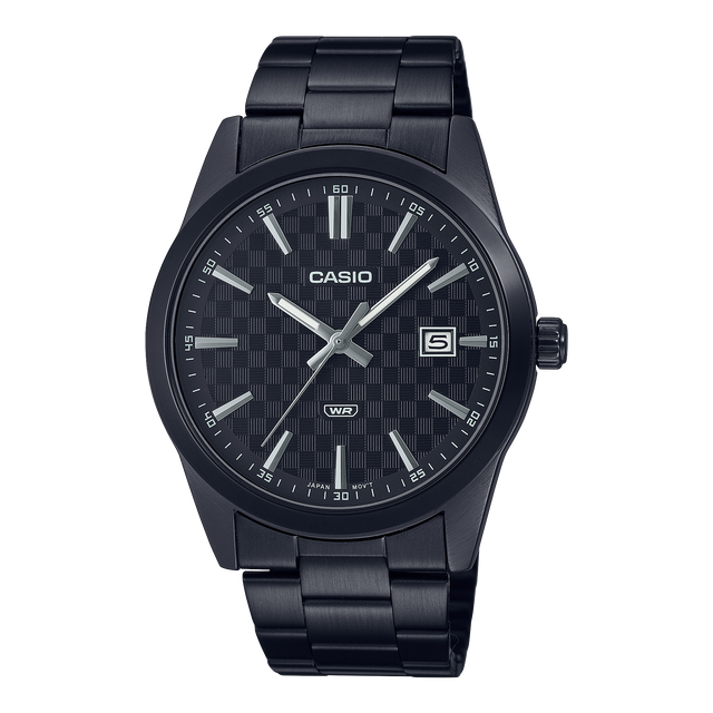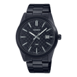 Reloj Casio analógico con diseño moderno y elegante en color negro, equipado con tres manecillas clásicas y ventana de fecha. Su construcción en acero inoxidable con baño de iones ofrece durabilidad y un estilo versátil perfecto para uso diario.