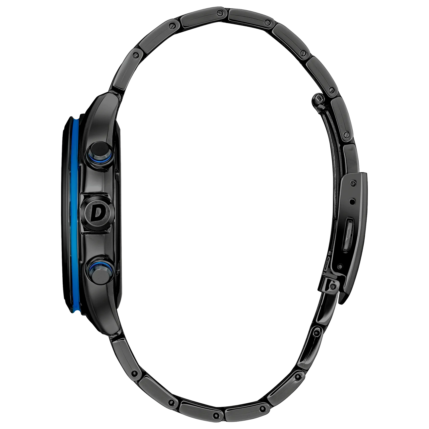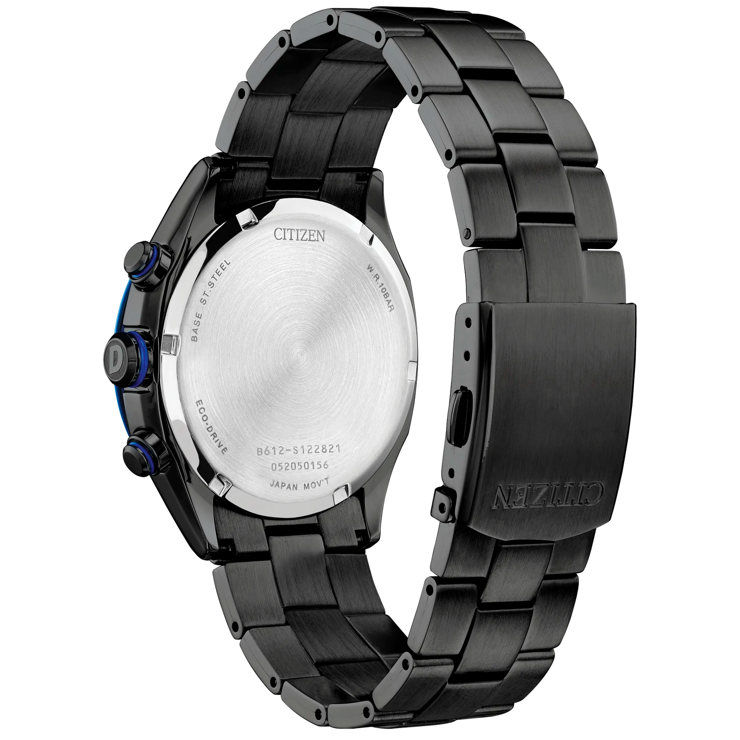 Para una apariencia más monocromática, el reloj Citizen CA0438-52E de la colección Drive combina una elegante caja y brazalete de acero inoxidable en tono negro con una carátula negra y detalles en azul. Su diseño moderno y versátil lo convierte en el complemento ideal para toda la semana. Incorpora cronógrafo, formato de 12/24 horas, fechador y tecnología Eco-Drive que se alimenta con luz, sin necesidad de cambiar la batería.
