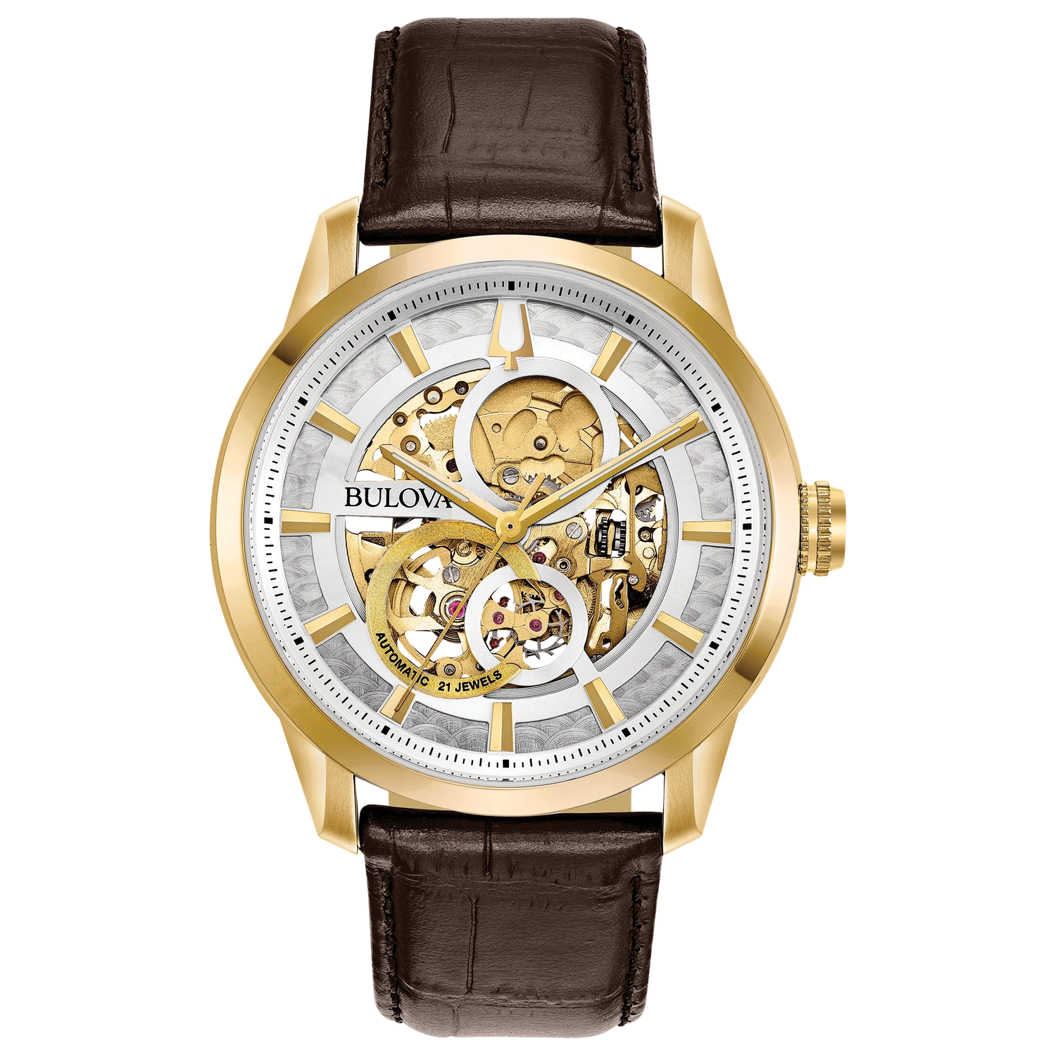 El Bulova Sutton 97A138 es un elegante reloj automático con diseño skeleton completo, que permite admirar el movimiento mecánico en funcionamiento. Su combinación de caja dorada, carátula plata/oro y correa de cuero lo convierten en una pieza clásica con presencia sofisticada.