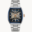 Reloj Bulova modelo 98A319 con movimiento automático 8N26, caja de acero inoxidable bicolor de 40 mm, esfera azul con detalles en oro rosa y diseño skeleton, cristal de zafiro curvado antirreflejante, brazalete de acero inoxidable y resistencia al agua de 50 metros.