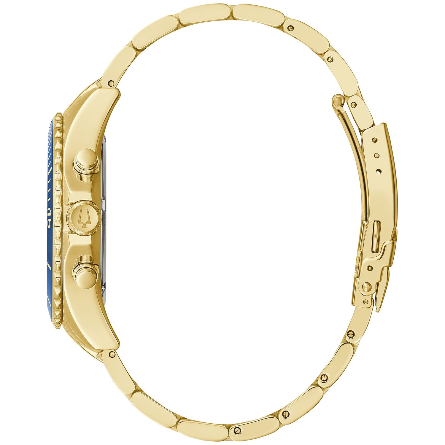 El Bulova 98B377 es un cronógrafo deportivo con una presencia llamativa gracias a su acabado dorado y carátula azul mate. Equipado con funciones de cronógrafo, luminiscencia y fechador, combina estilo moderno con funcionalidad diaria.