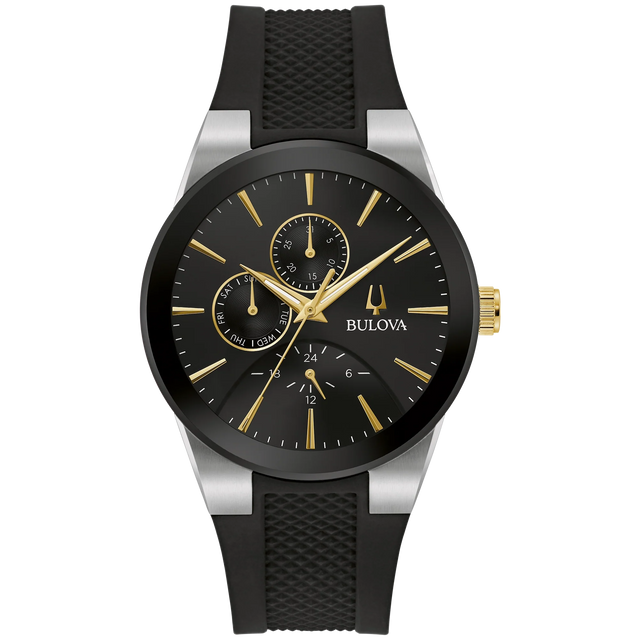 El Bulova Modern Millenia 98C146 combina un estilo contemporáneo con elementos deportivos, destacando su carátula negra con acentos dorados, cristal mineral abombado y correa de silicona. Su diseño moderno y funcionalidad de día/fecha lo convierten en un reloj versátil para el uso diario.