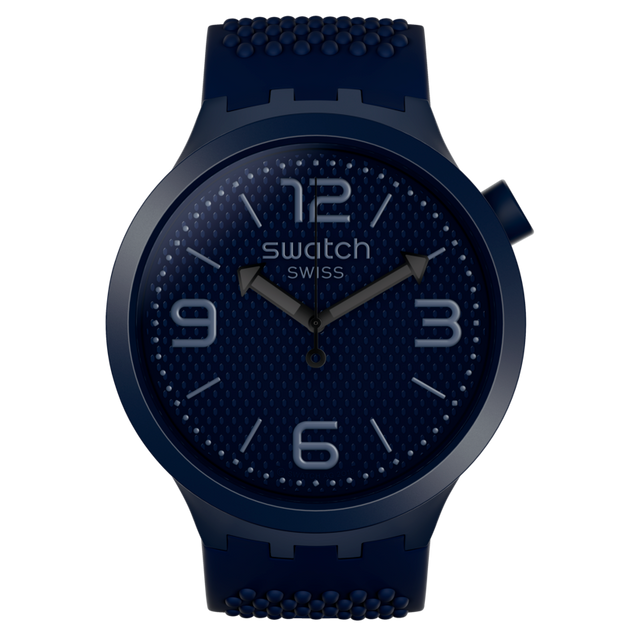Reloj Swatch unisex de estilo urbano y llamativo, con caja Big Bold en polímero azul, correa de silicona y movimiento suizo de cuarzo. Diseño monocromático con excelente legibilidad y detalles luminiscentes.