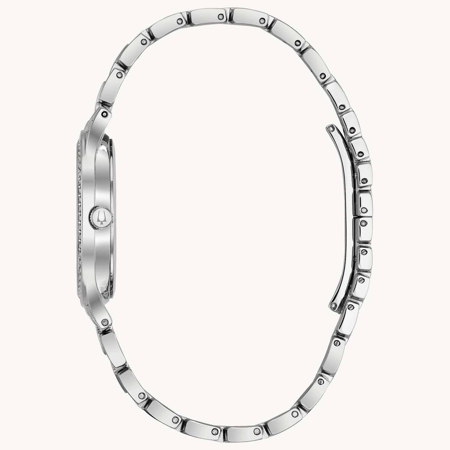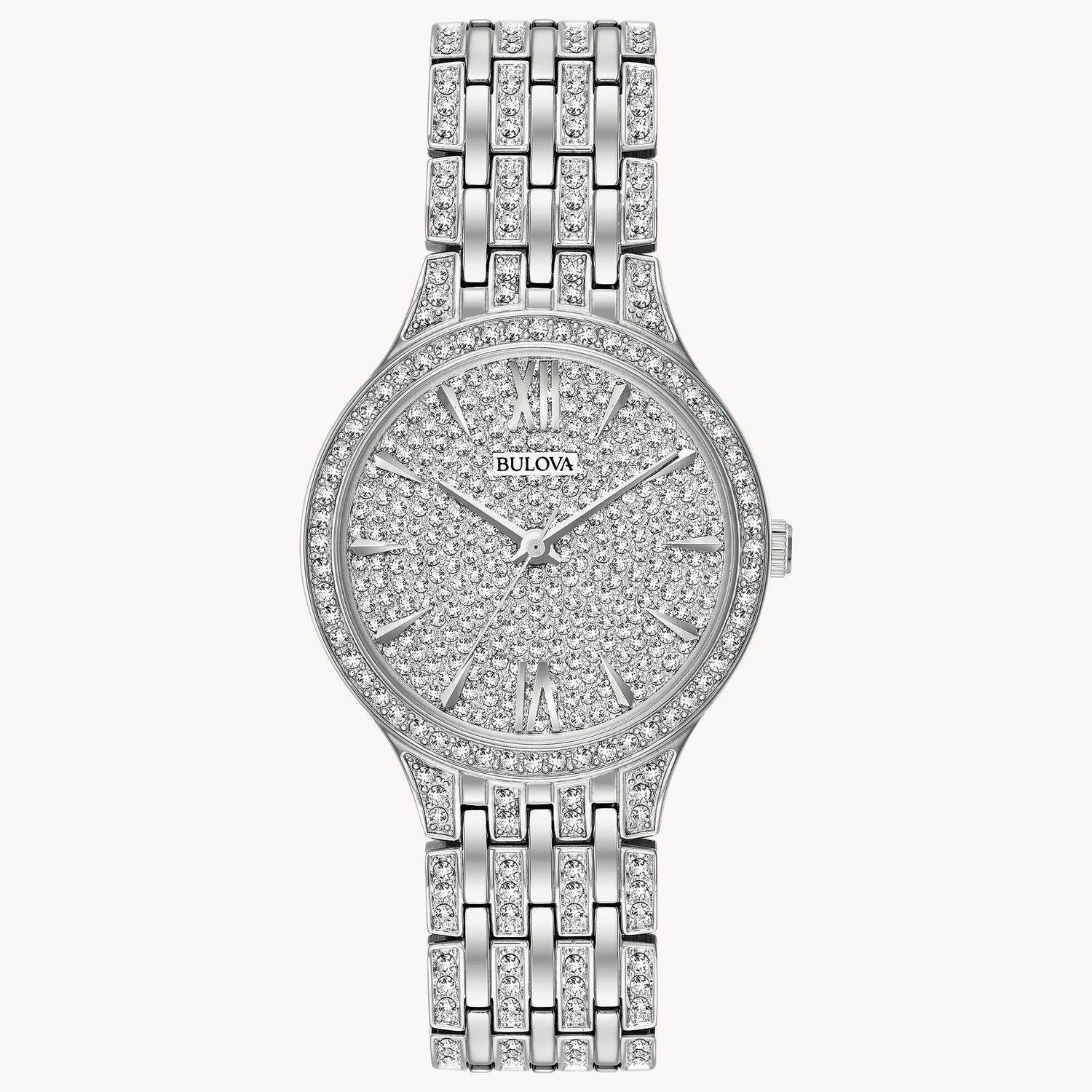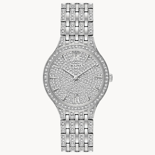 Reloj Bulova para dama de la colección Crystal, con un elegante diseño delgado completamente adornado con cristales pavé en el bisel, brazalete y carátula. Un estilo brillante y sofisticado ideal para ocasiones formales.