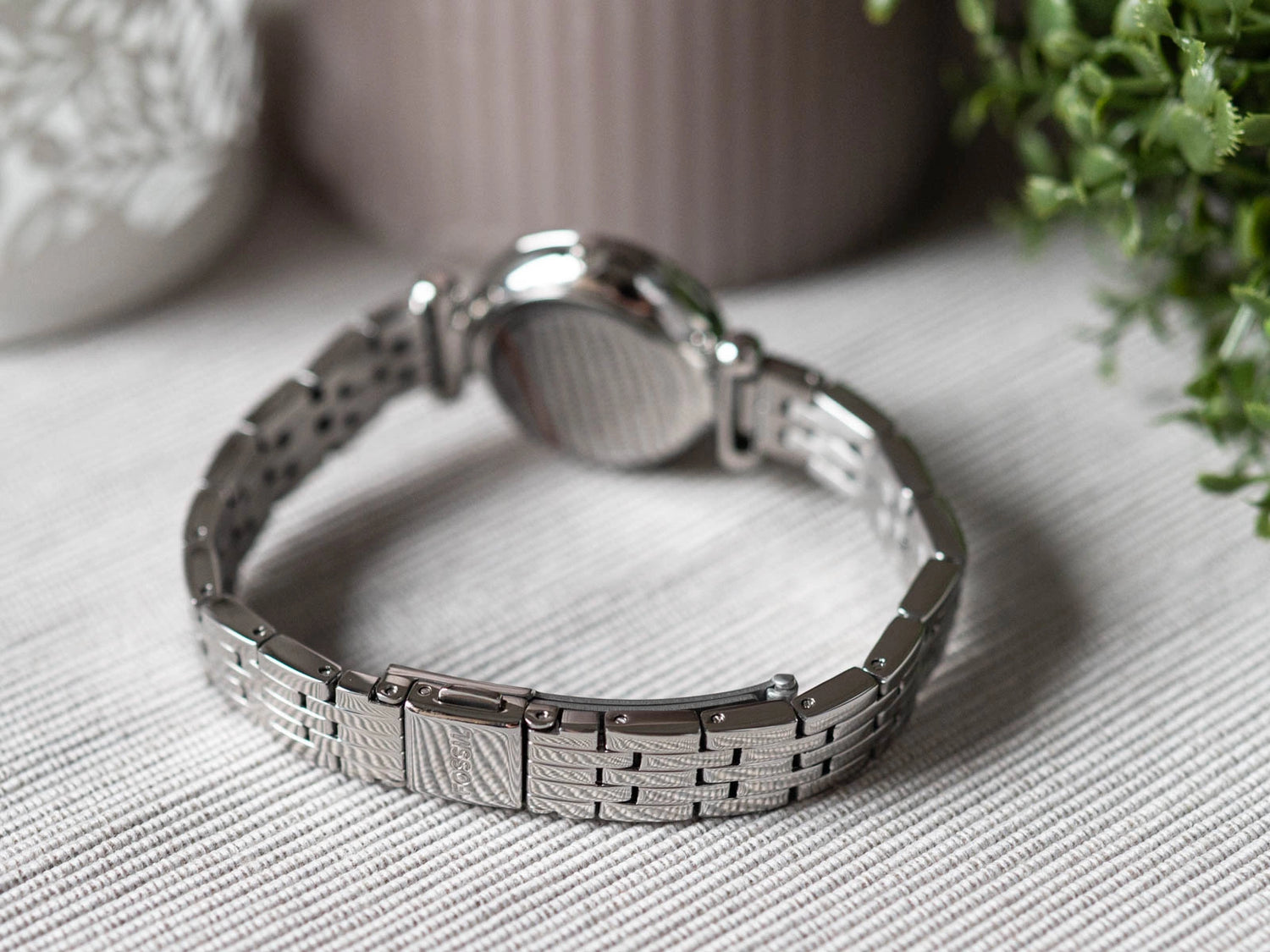 El Fossil BQ5028 combina la elegancia de una joya con la precisión de un reloj moderno. Su caja plateada con cristales decorativos y su esfera azul perlada crean un estilo delicado y sofisticado, ideal para complementar cualquier atuendo. Fabricado en acero inoxidable con un diseño fino y ligero, ofrece resistencia y durabilidad sin perder su encanto femenino.
