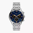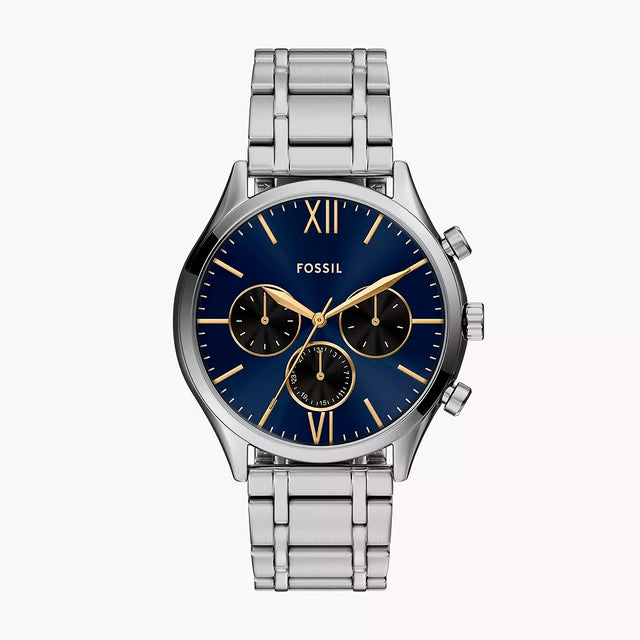 Reloj Fossil de la colección Fenmore con un diseño elegante y contemporáneo. Su amplia caja plateada de 44 mm, carátula azul y brazalete de acero inoxidable lo convierten en una pieza sofisticada ideal para uso diario o formal.