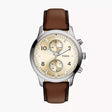 Reloj Fossil Bennett con diseño elegante y sofisticado. Su carátula color pergamino con efecto “rayos de sol” y subesferas del mismo tono crean un contraste cálido y refinado. La combinación de caja plateada y correa de piel marrón ofrece un estilo clásico y atemporal.