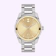 Reloj Movado Bold con diseño elegante y contemporáneo. Presenta una carátula dorada con marcadores tipo índice y manecillas plateadas luminiscentes, acompañadas de una caja y brazalete de acero inoxidable. Su combinación de tonos metálicos crea una apariencia moderna, sofisticada y distintiva.