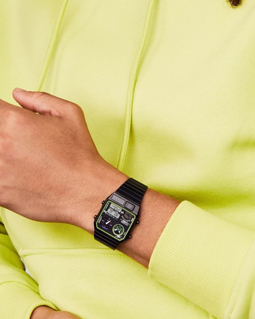 El exclusivo Citizen Trench Run rinde homenaje a los relojes análogo-digitales de los años 80 con un diseño inspirado en la cabina del X-Wing y el TIE Fighter. Su caja rectangular en acero inoxidable negro y su carátula multifunción evocan los instrumentos de vuelo de la saga, ideal para fans que desean llevar una pieza auténtica y llena de historia. Equipado con cronógrafo, alarma, horario dual, calendario perpetuo y sensor de temperatura en °C, es el acompañante perfecto para cualquier misión galáctica.