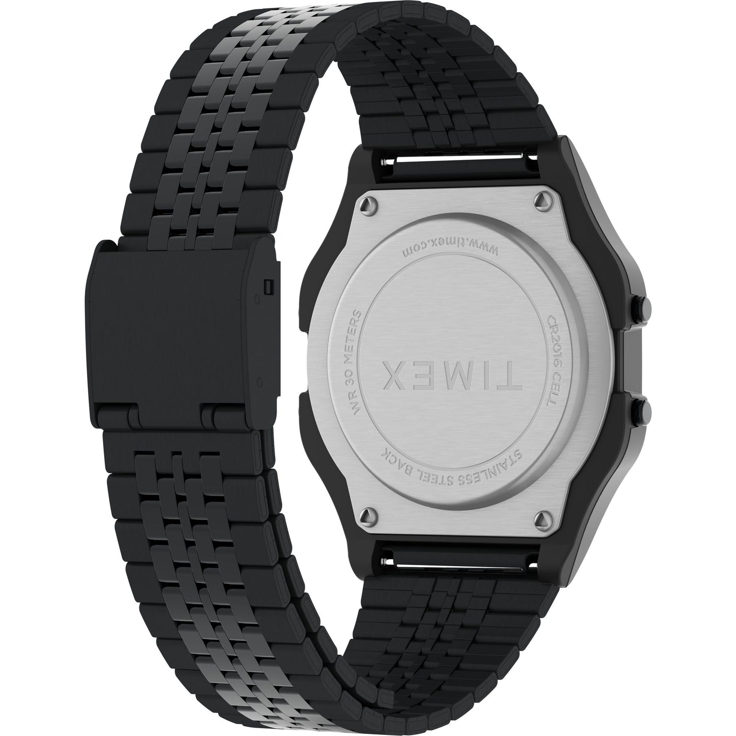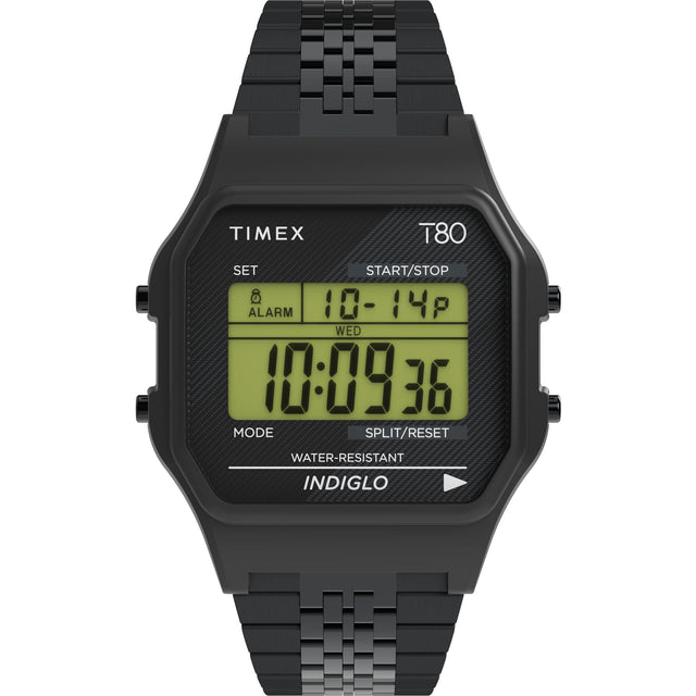 • Descripción: Reloj digital T80 retro con caja negra pulida de 34mm de forma única, brazalete negro de acero inoxidable autoajustable, esfera digital e iluminación Indiglo®.