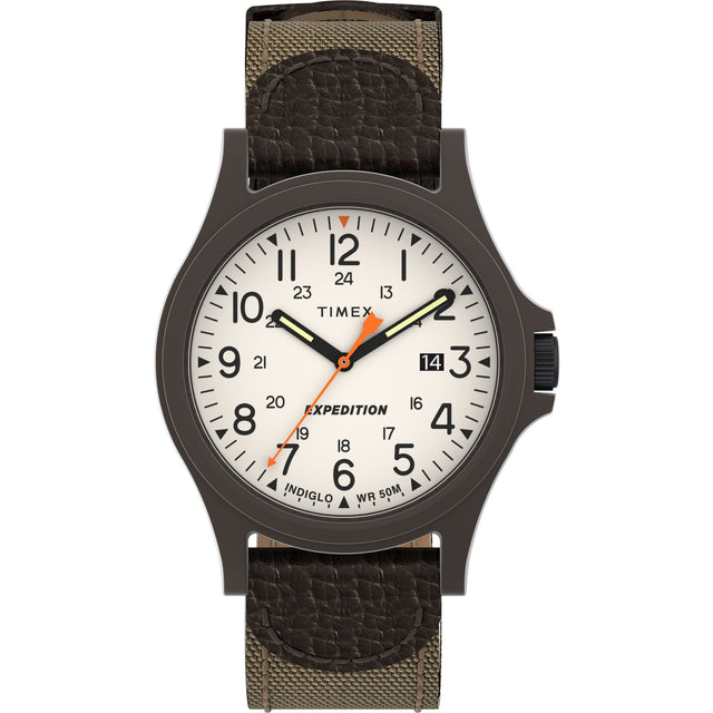 • Descripción: Reloj Expedition Acadia con caja de resina marrón mate de 40mm, correa de tela beige con pestañas de cuero marrón, esfera natural con números arábigos completos e iluminación Indiglo®.