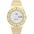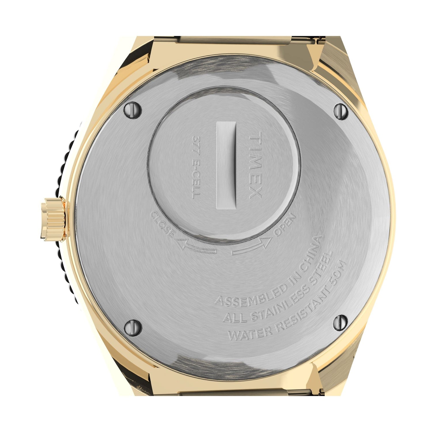 • Descripción: Reloj Q Timex de 36 mm con caja de acero inoxidable en tono dorado y acabado cepillado/pulido, brazalete de acero inoxidable dorado con broche desplegable, y esfera color crema con índices completos y manecillas luminiscentes; resistencia al agua de 50 metros.
