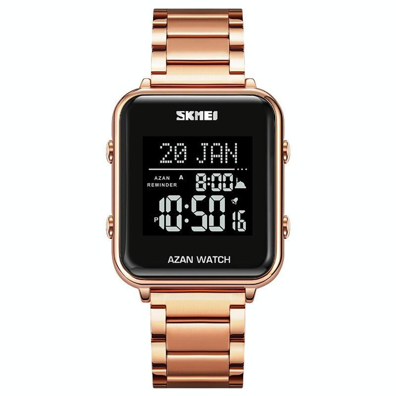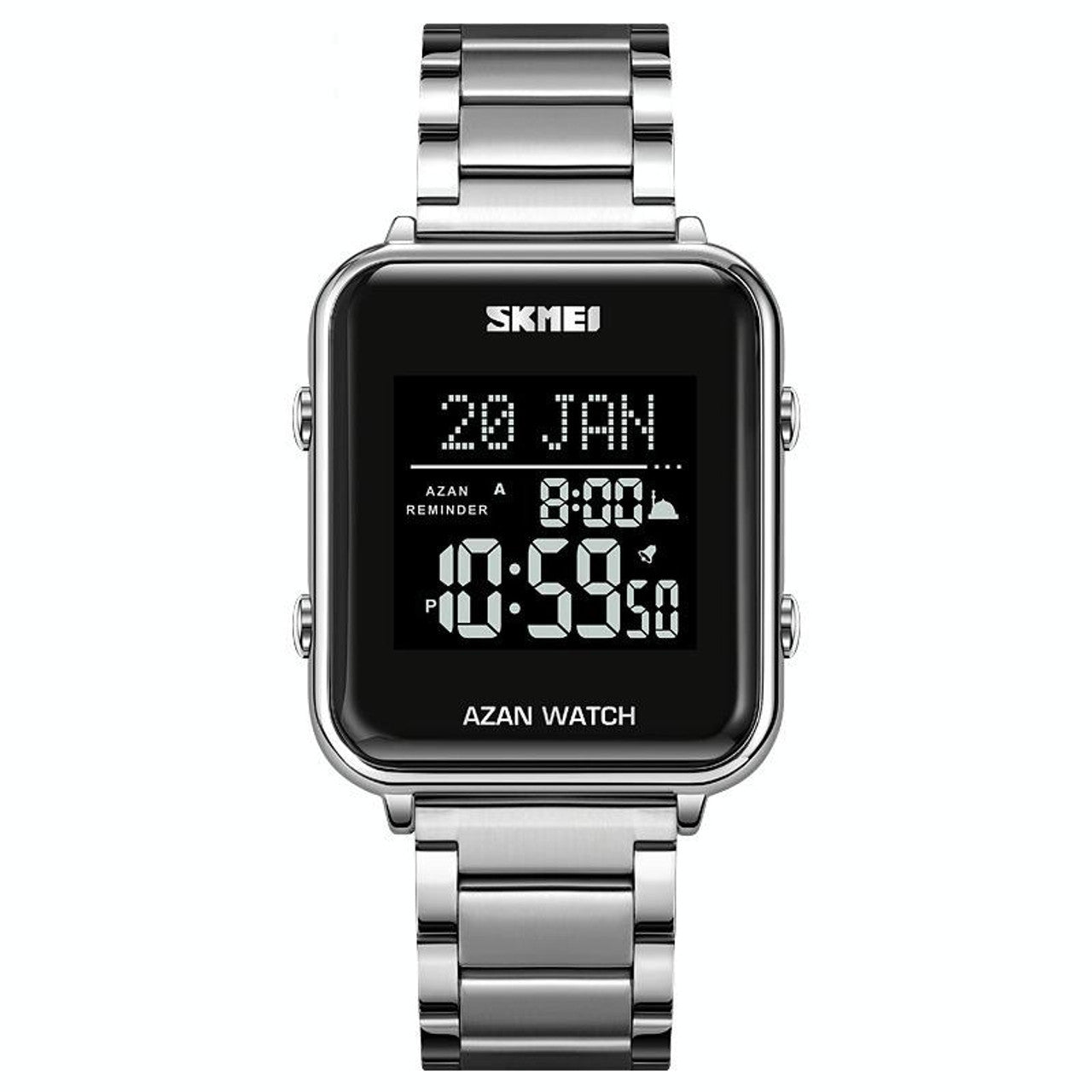 • FUNCIÓN: Recordatorio del tiempo de peregrinación. Visualización del nombre de Qibla. Dirección de Qibla, mes religioso, día religioso. Calendario gregoriano, calendario Hijri. Datos de la ciudad, horario de verano, marcador, selección de idioma, ajuste de volumen, batería restante, hora, crono, alarma, fecha, semana, luz EL, reloj de 12/24 horas.