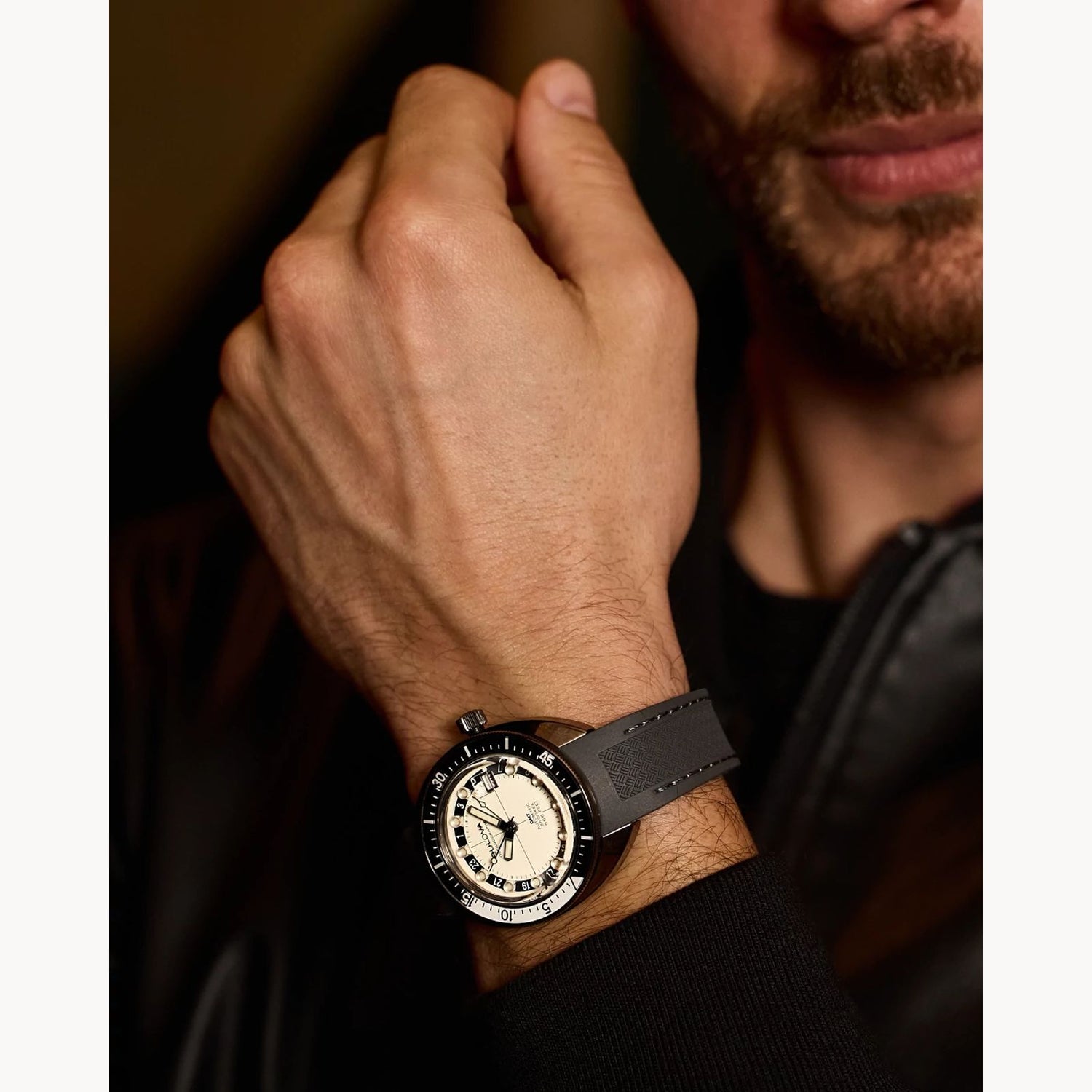 Reloj Bulova modelo 98B407 con movimiento automático GMT, caja de acero inoxidable gris de 41 mm, cristal de zafiro doble curvado, esfera blanca luminiscente, fechador y correa de poliuretano.