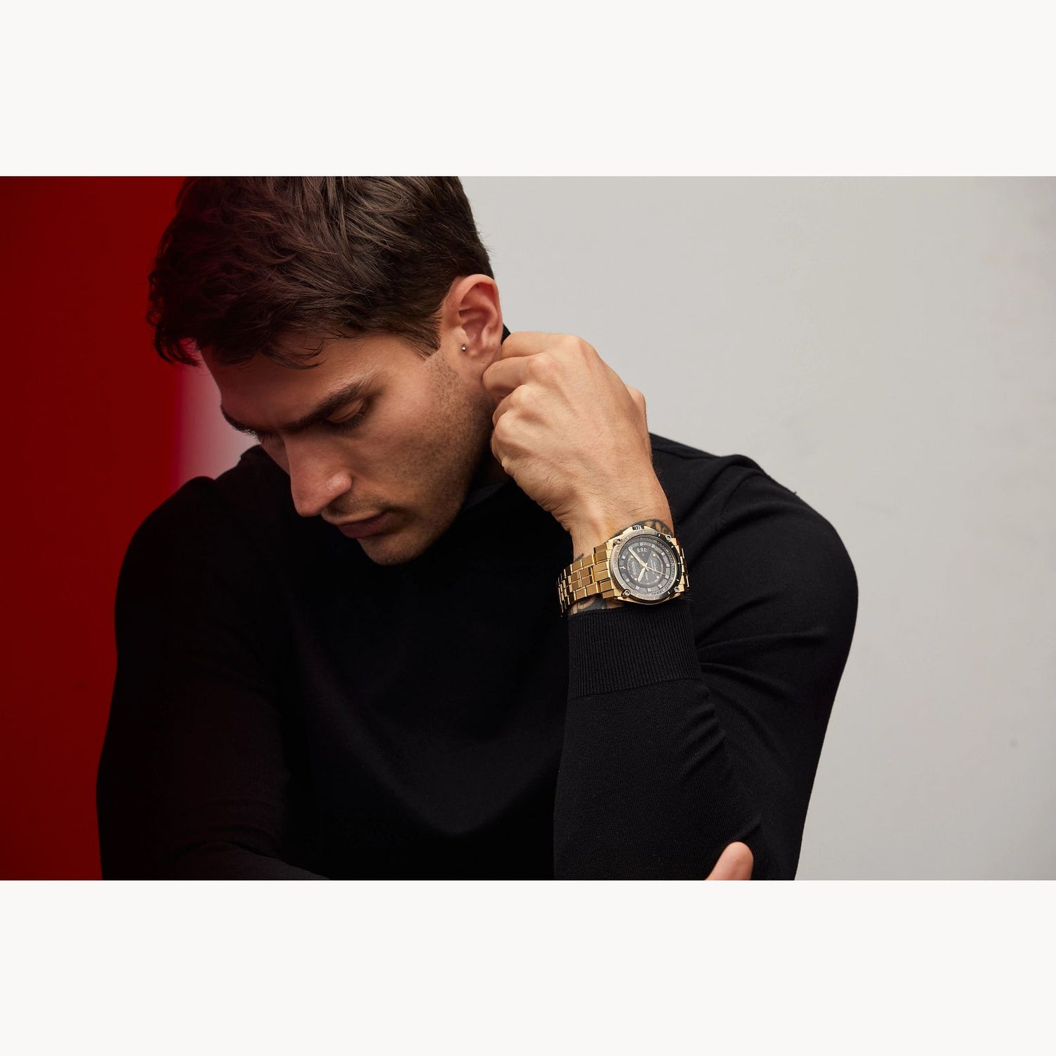 Reloj Bulova modelo 98D156 con movimiento HPQ Precisionist, caja bicolor de acero inoxidable de 46.5 mm, cristal mineral curvo, esfera negra con manecillas luminiscentes, calendario y brazalete de acero inoxidable.