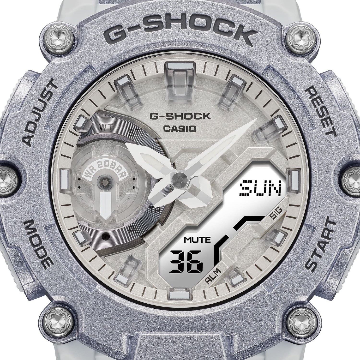 Hora normal: Analógica: 2 manecillas (hora, minuto (la manecilla se mueve cada 20 segundos)), 1 dial (modo) Digital: Hora, minuto, segundo, pm, mes, fecha, día