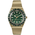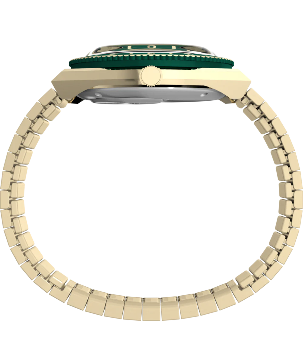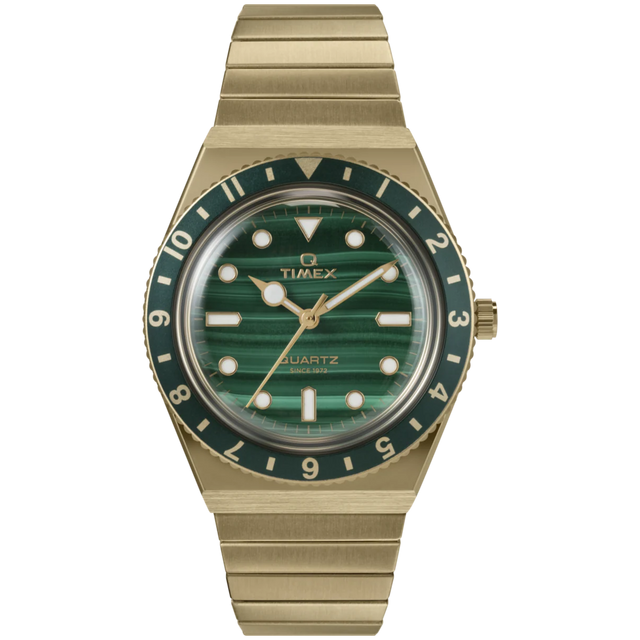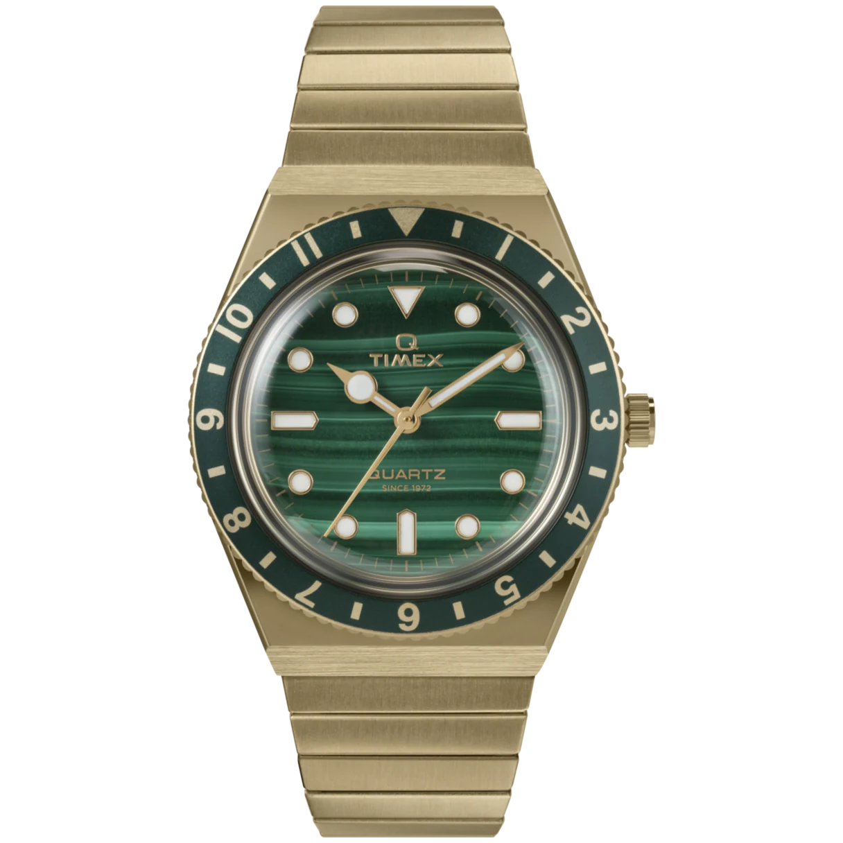• Descripción: Reloj Q Timex para mujer con caja y brazalete extensible en tono dorado y esfera de malaquita