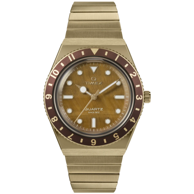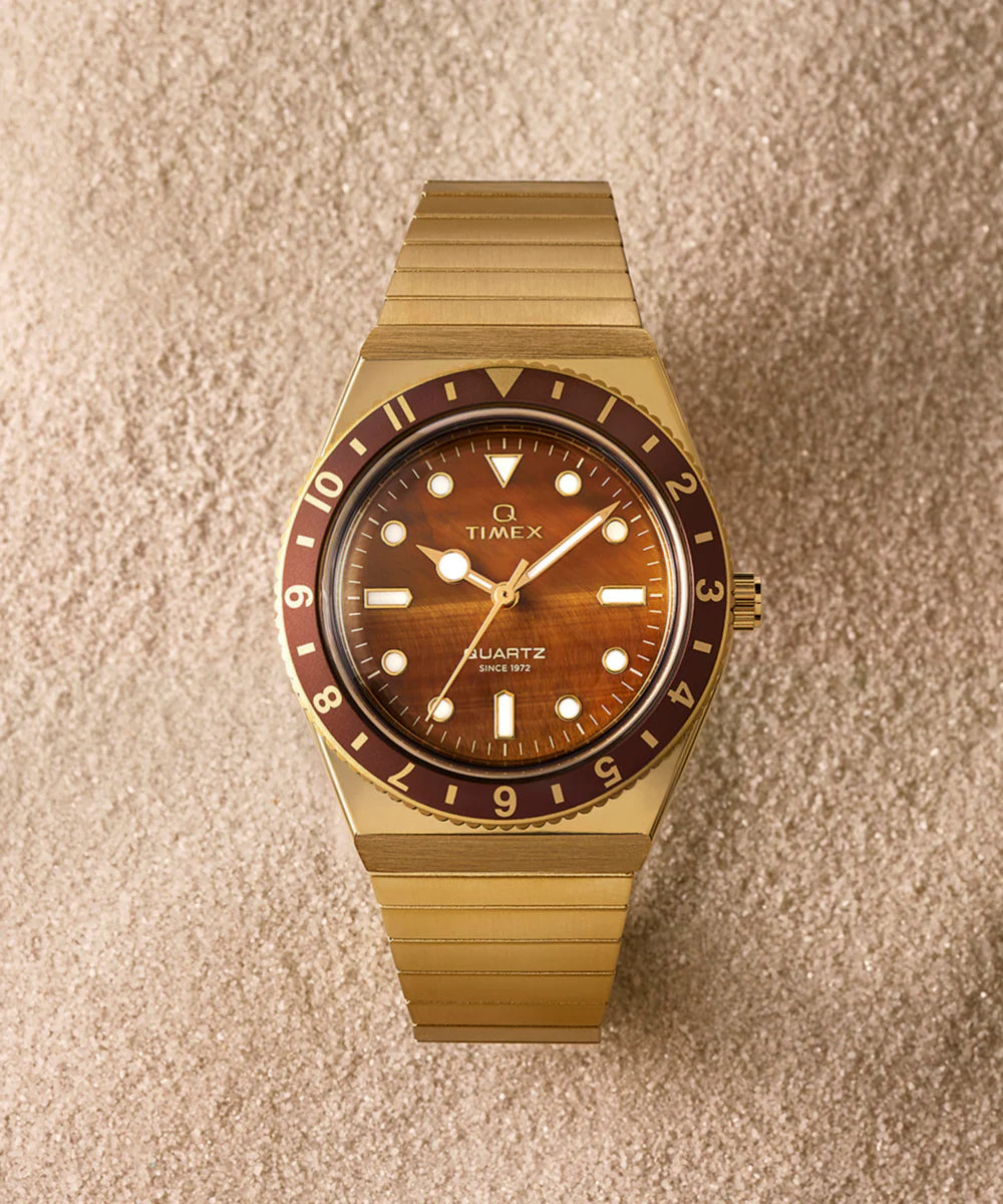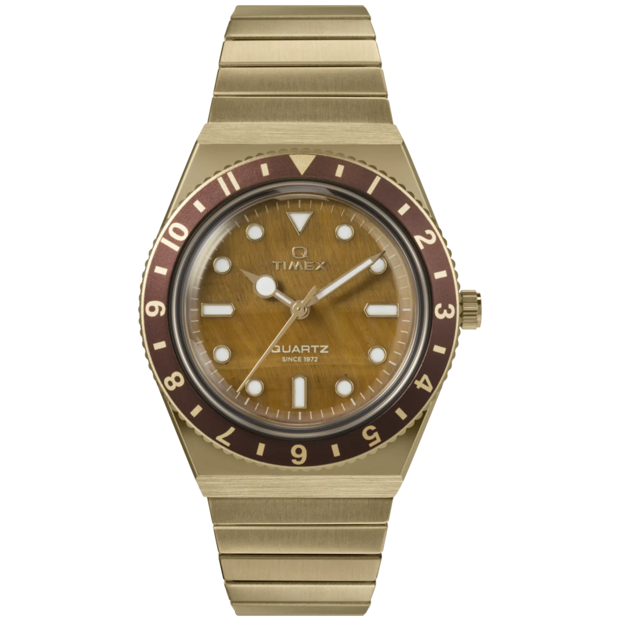 • Descripción: Reloj Q Timex para mujer con caja y brazalete extensible en tono dorado y esfera de ojo de tigre