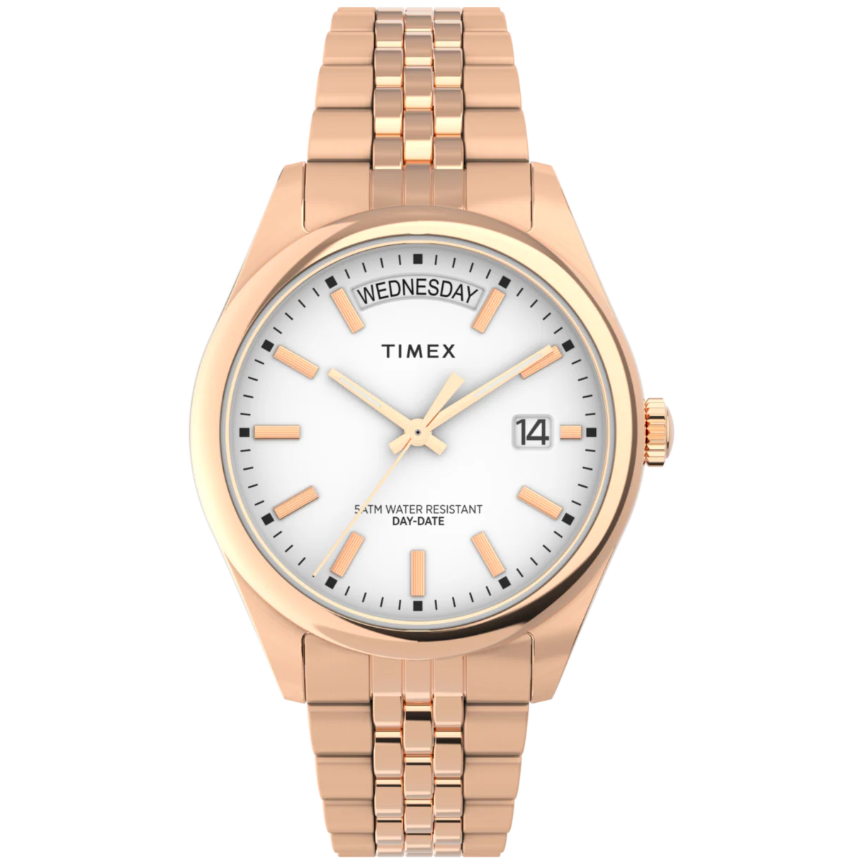 • Descripción: Reloj femenino Legacy con caja y brazalete de acero inoxidable en tono oro rosado, esfera blanca y diseño elegante atemporal.