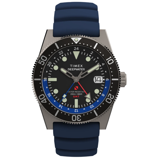 • Descripción: Reloj Timex Deepwater Reef 200 GMT de 41 mm, con caja de acero inoxidable con acabado titanio cepillado, bisel negro de aluminio, esfera negra con función GMT y correa de caucho negro con hebilla azul.