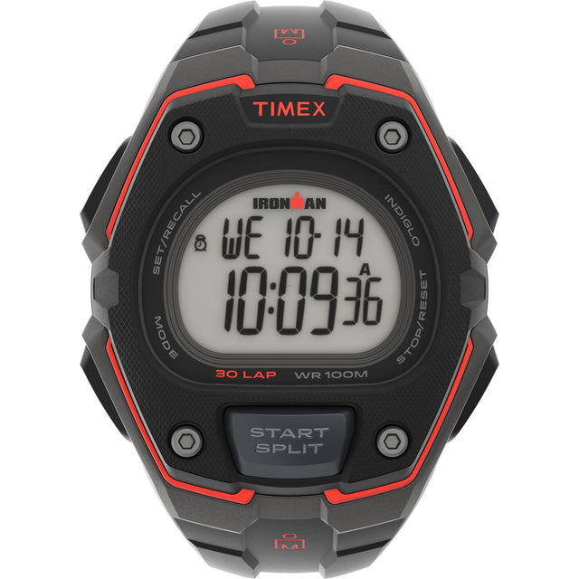 • Descripción: Reloj digital TIMEX IRONMAN Classic 30 Oversized con caja de resina negra y gris, detalles en rojo y correa negra de resina.