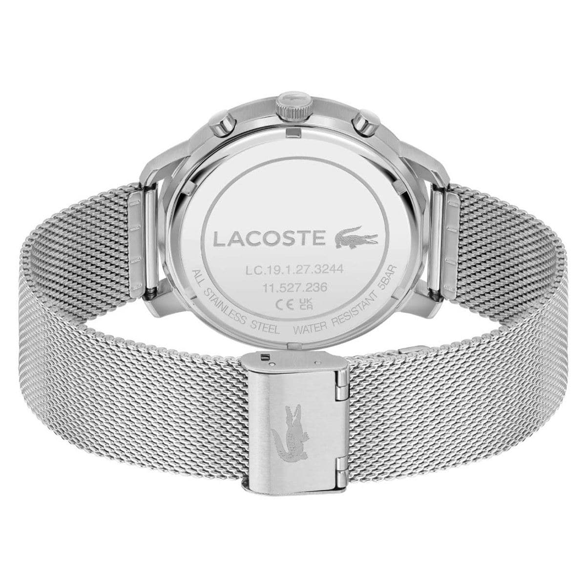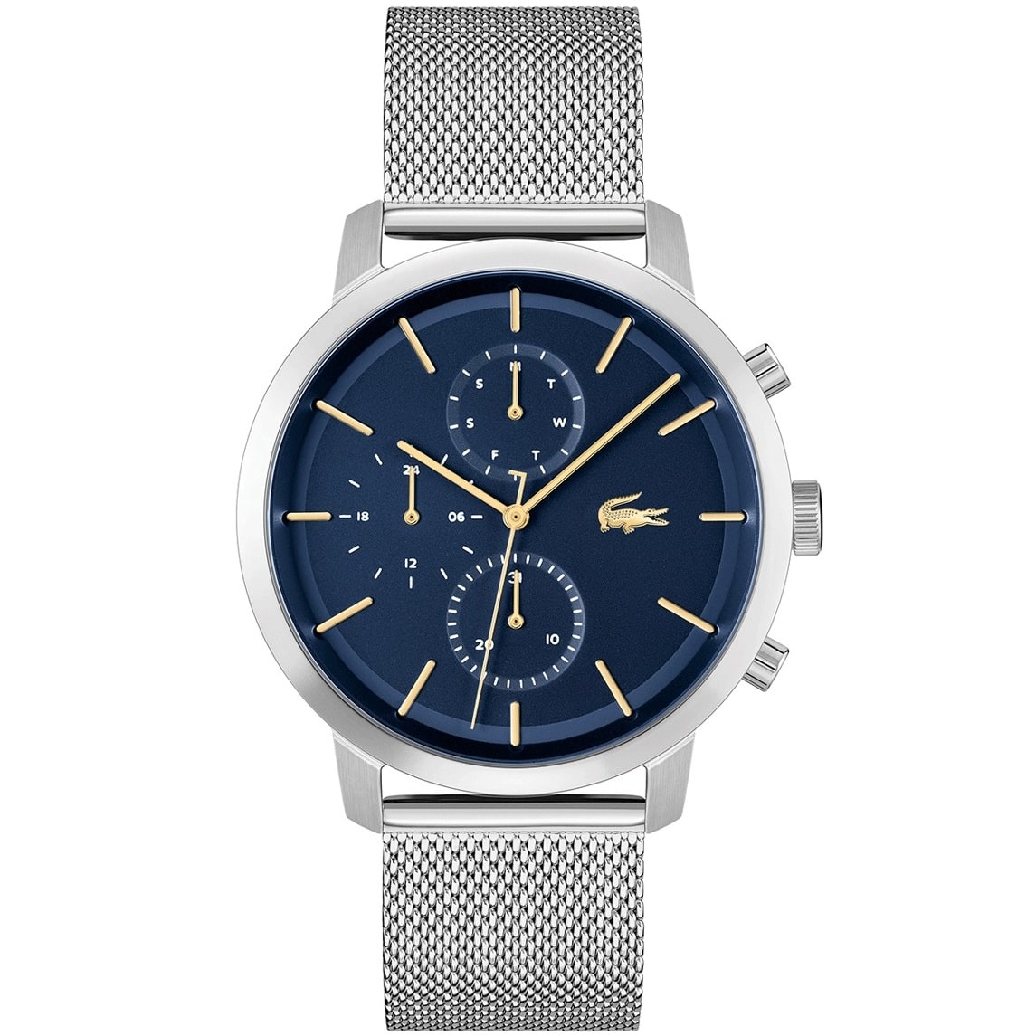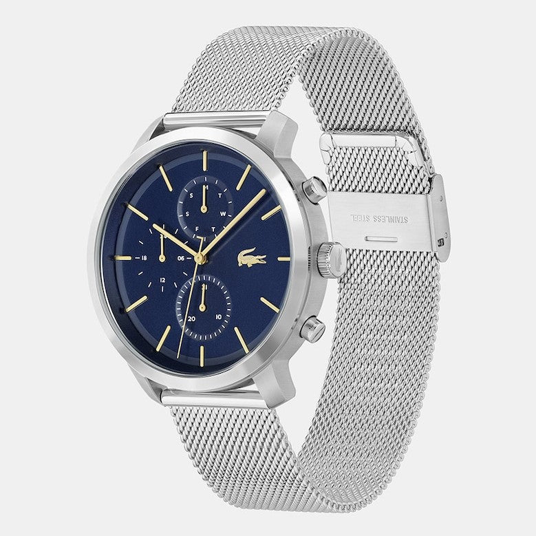Reloj para caballero con caja de acero de 44mm., esfera azul con día de la semana y calendario. Correa de malla milanesa en acero, cristal mineral y es sumergible 5 atm.