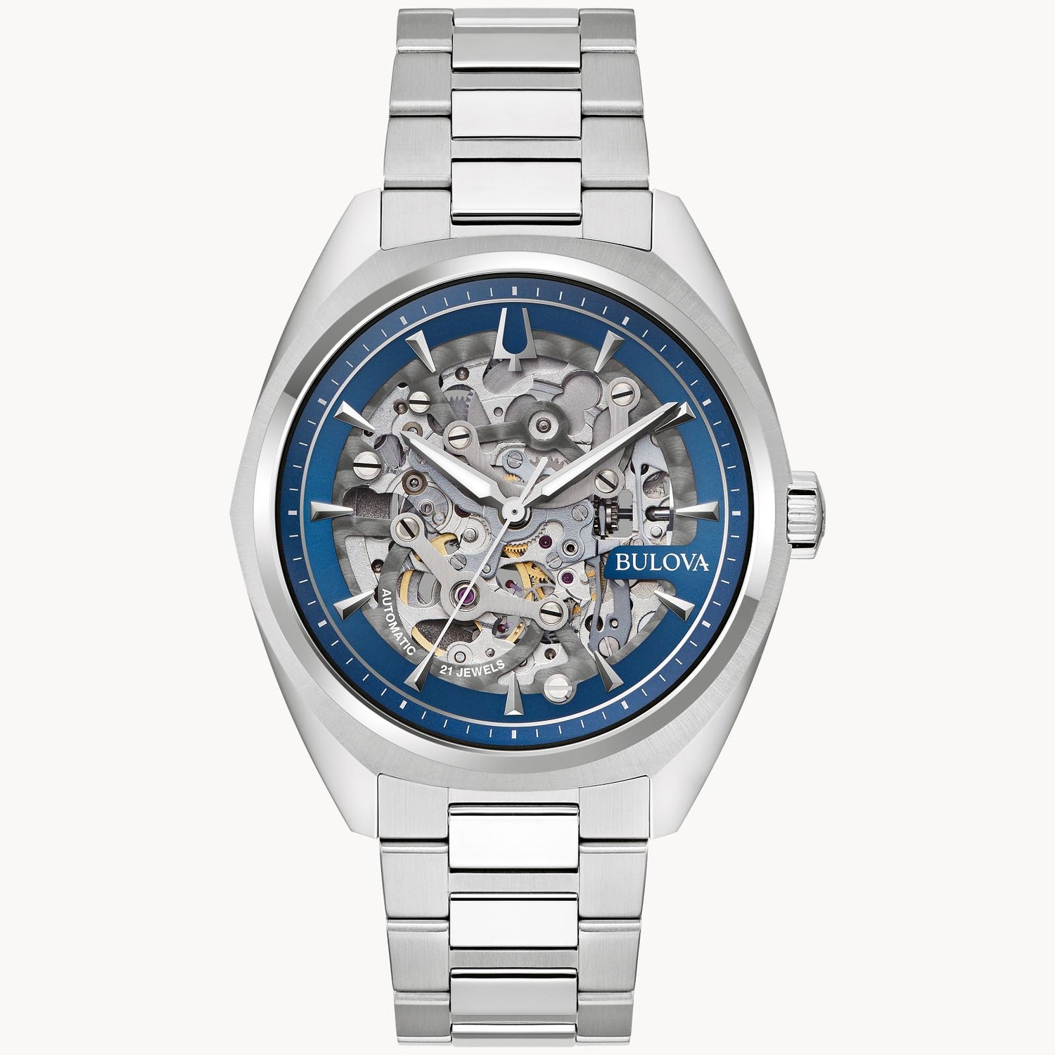 Reloj Bulova modelo 96A292 con movimiento automático 8N26, diseño esqueletado, caja de acero inoxidable blanco-plateada de 41 mm, cristal mineral abombado, brazalete metálico y reserva de marcha de 42 horas. Esfera azul con detalles en plateado. Resistente a salpicaduras.