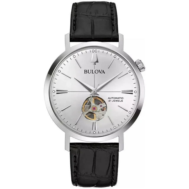 **Descripción breve:** Reloj Bulova 96A315 para hombre, con movimiento automático, caja de acero inoxidable plateado, correa de cuero negro y pantalla analógica. Resistencia al agua de 30 metros, diseño elegante para uso diario.