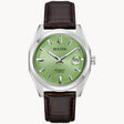 Reloj Bulova modelo 96B427 con movimiento automático 8215, caja de acero inoxidable plateado de 39 mm, cristal de zafiro antirreflejante, esfera verde con manecillas luminiscentes, correa de cuero y resistencia al agua de 30 metros.