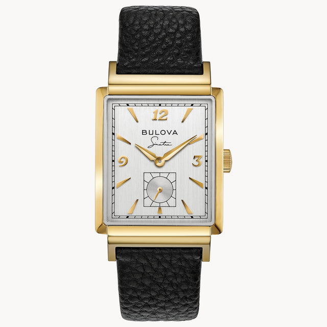 • Descripción: Inspirado en los diseños vintage de Bulova y en la inconfundible elegancia de Frank Sinatra, el reloj “My Way” combina estilo clásico y detalles llenos de historia. Presenta una caja rectangular de acero inoxidable en tono dorado con esfera plateada, manecillas e índices dorados. La firma de Frank Sinatra aparece bajo el logotipo de Bulova, mientras que su icónico sombrero Fedora está grabado en la corona y en el fondo de la caja junto con el nombre del modelo. Su correa de cuero negro con cierre desplegable aporta distinción y comodidad, con el nombre “My Way” grabado en el interior. El cristal de zafiro curvo y su resistencia al agua de 30 metros completan este homenaje al legendario artista.