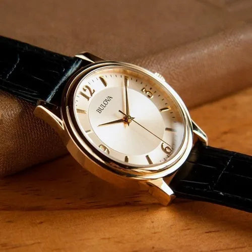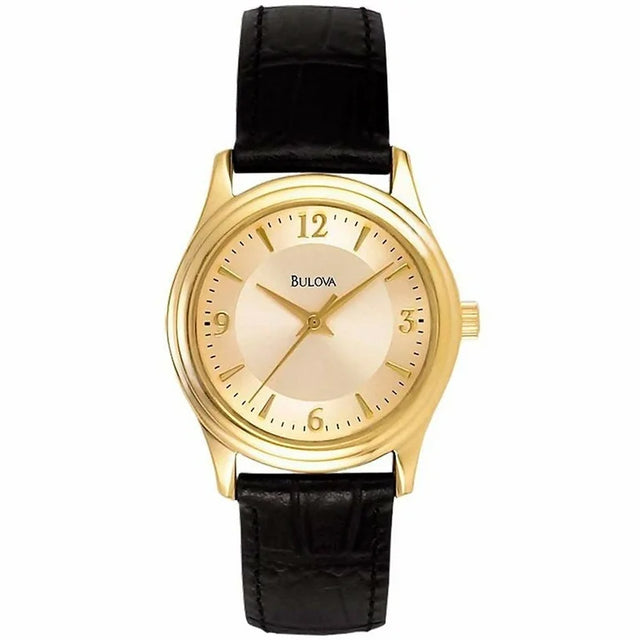**Descripción breve:** Reloj Bulova 97V25 para mujer, con movimiento de cuarzo, caja redonda de acero inoxidable dorado, correa de piel negra y cristal mineral. Diseño elegante con pantalla analógica y resistencia al agua de 30 metros.